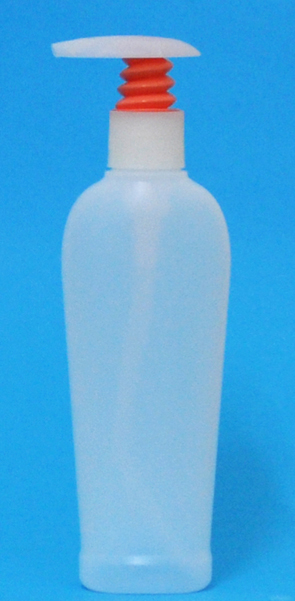 SNSET-K02-NATURAL PLASTIC BOTTLE, 200 ML HDPE REVERSE TAPERED OVAL WITH A 24/410 FINISH, FOOTED PLUS BLUE 24/410 Pump